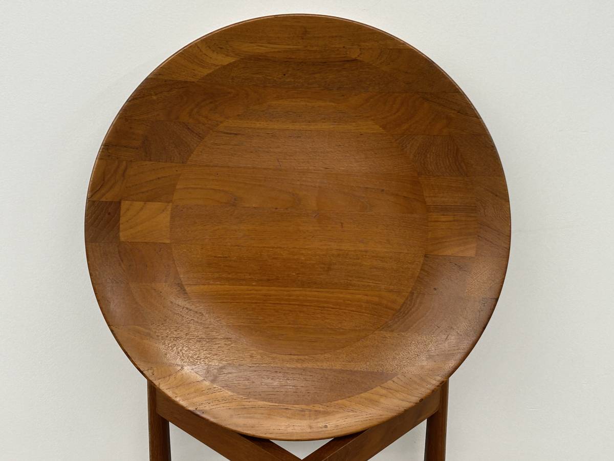 Round teak top is concave on one side and flat on the other