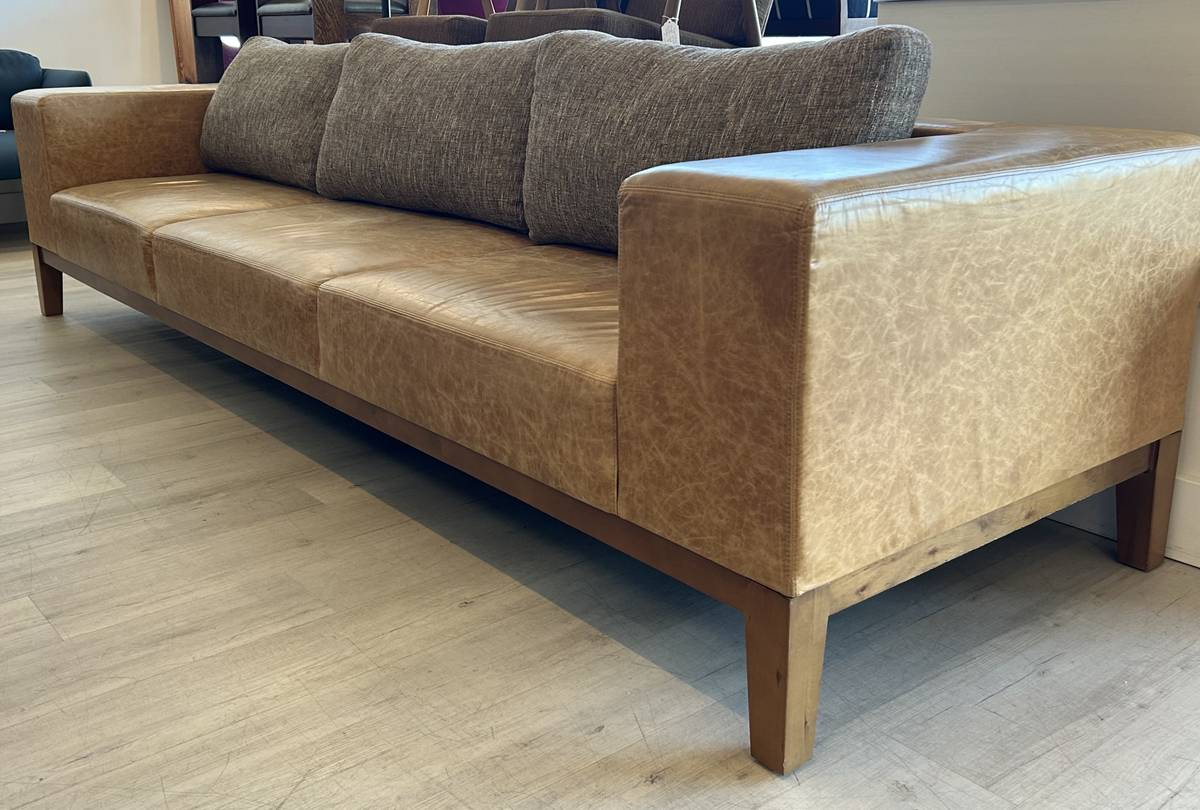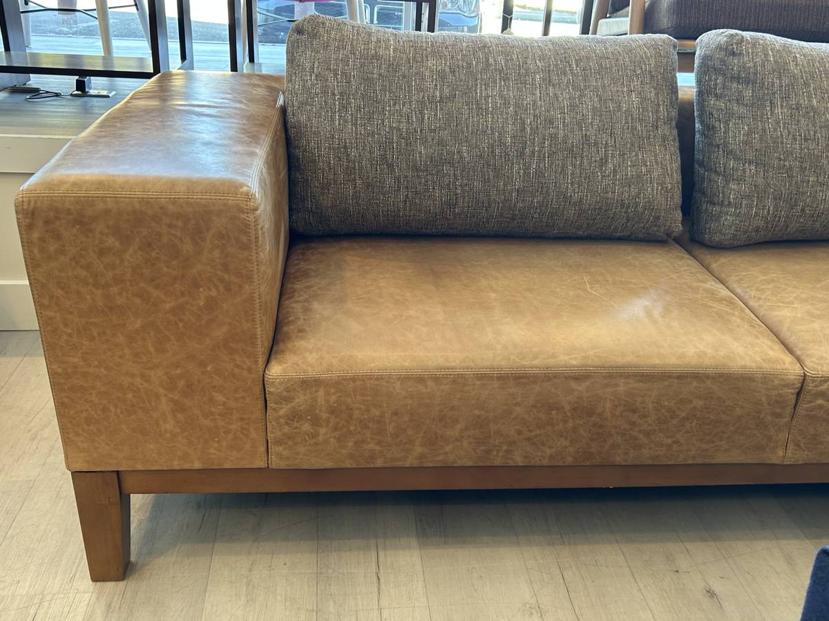 Beautiful custom made sofa Cognac color leather upholstery Tweed fabric seat back cushions Broad flat arms