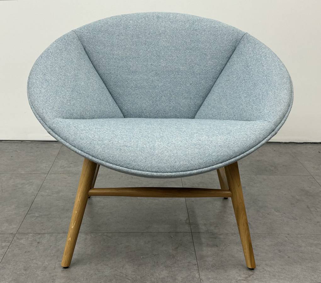 Sculptural nest style seat upholstered in navy blueNatural finish tapered oak legs