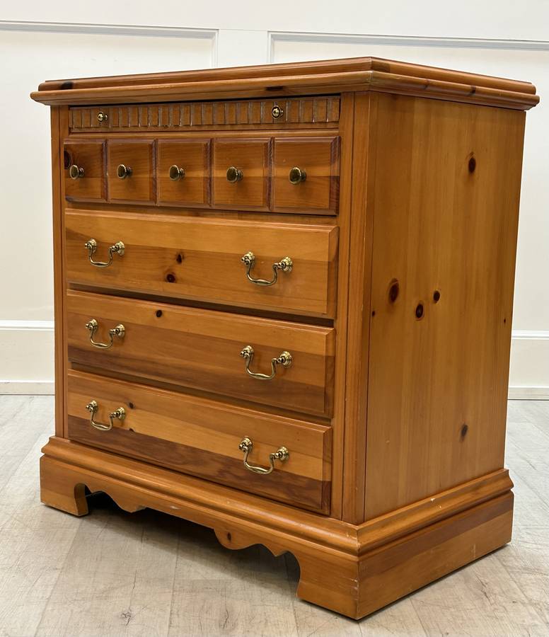 Knotty pine4 drawersBrass hardwareFeatures a pullout tray table or writing table