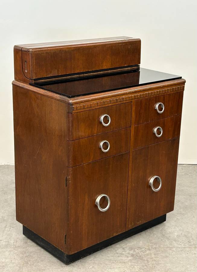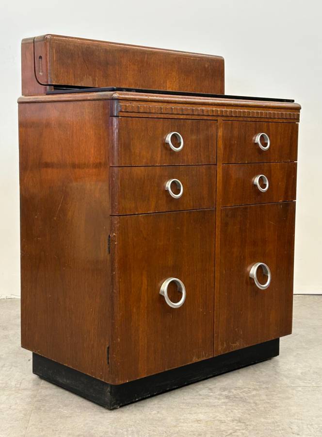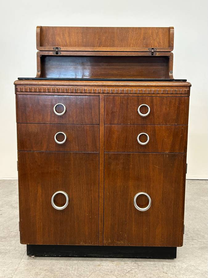 Door on the back edge of the cabinet top lifts to reveal a hidden compartment